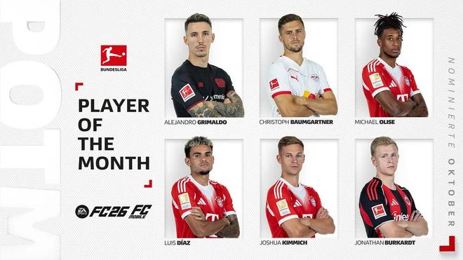 北京时间10月29日,德甲官方公布了10月最佳球员的候选名单,其中格里马尔、奥利塞、路易斯-迪亚斯、基米希等人在列。